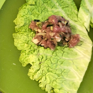 3. Remove the remaining green cabbage leaves (not the inner white leaves) microwave one by one for 30 seconds. Remove the spine can cut them in half lengthwise